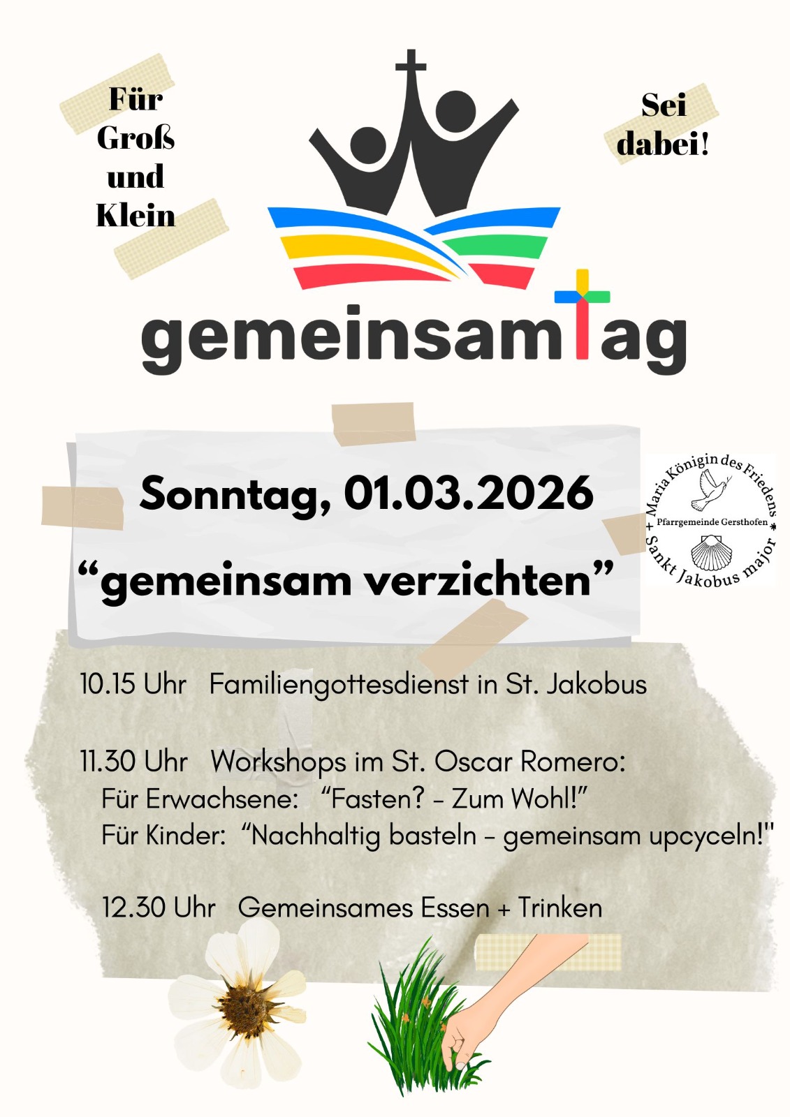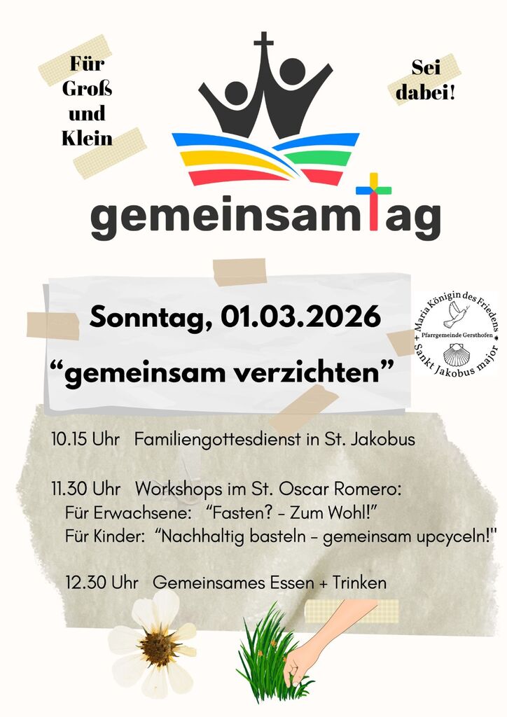 Am Sonntag, 1. März 2026, lädt die Pfarrgemeinde Gersthofen herzlich zum gemeinsamtag ein. Die Veranstaltung beginnt um 10:15 Uhr mit einem Familiengottesdienst in der Kirche Sankt Jakobus. Im Anschluss daran erwarten euch im Pfarrzentrum Oskar Romero Aktivitäten für alle Altersgruppen, die das Motto „Gemeinsam Teilen“ lebendig werden lassen.