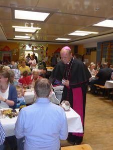 Zum Abschluss der Visitation feierte Weihbischof Florian Wörner zusammen mit zahlreichen Gläubigen in der Pfarrkirche Maria, Königin des Friedens einen festlichen Gottesdienst. Da am 02. Oktober auch der Erntedanksonntag war, brachten die Kinder am Beginn viele Erntegaben zum Altar. Der Festgottesdienst wurde von den Kirchenchören der Pfarreiengemeinschaft und vielen Musikern mit modernen geistlichen Liedern gestaltet. Bereits am Vorabend fand in St. Jakobus ein Jugendgottesdienst statt, bei dem die Jugendband Inspiration musizierte. Nach dem Festgottesdienst wurde in den Räumen des Elisabethkindergartens zum Pfarrschoppen geladen, bei dem es auch die Möglichkeit zur Begegnung mit dem Weihbischof gab. Dieser war seit Freitag, 30. September, in den verschiedenen Bereichen der Pfarreiengemeinschaft unterwegs und führte auch zahlreiche Gespräche mit den Mitarbeiterinnen und Mitarbeitern der Gemeinde. Am Freitag wurde auch ein Gottesdienst im AWO-Seniorenzentrum gefeiert, zu dem viele Bewohnerinnen und Bewohner kamen. Vielen Dank sage ich allen, die diese intensiven und schönen Tage mitgetragen haben. Dieser Dank gilt auch allen, die unsere Gottesdienste so schön gestaltet und mit viel Arbeit den Pfarrschoppen organisiert haben. Die Predigten des Weihbischof waren alle vom Gedanken der Stärkung im Glauben geprägt. Er ermutigte die Gläubigen, bei allen Veränderungen und Herausforderungen der heutigen Zeit, den Glauben zu leben und zu bezeugen. Für diesen Dienst der Stärkung im Glauben sage ich unserem Weihbischof einen ganz herzlichen Dank!